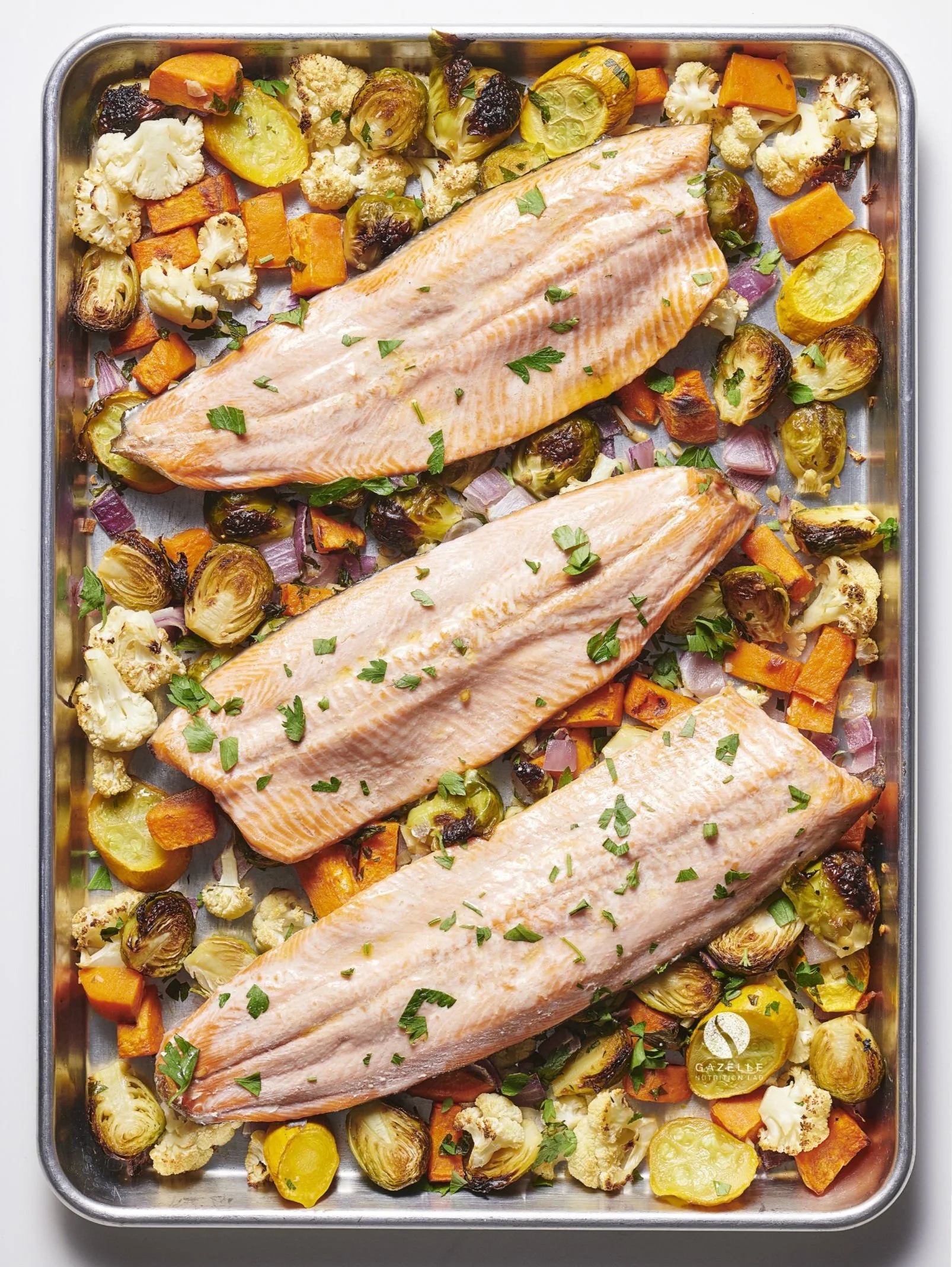 If you prepare this meal on a rest day opt for veggies with a higher water content like zucchini, tomatoes, and mushrooms. If you plan to enjoy your sheet pan trout after a workout, include starchy veggies like sweet potato or baby potatoes. Most of all, be creative and have fun. Happy fueling!